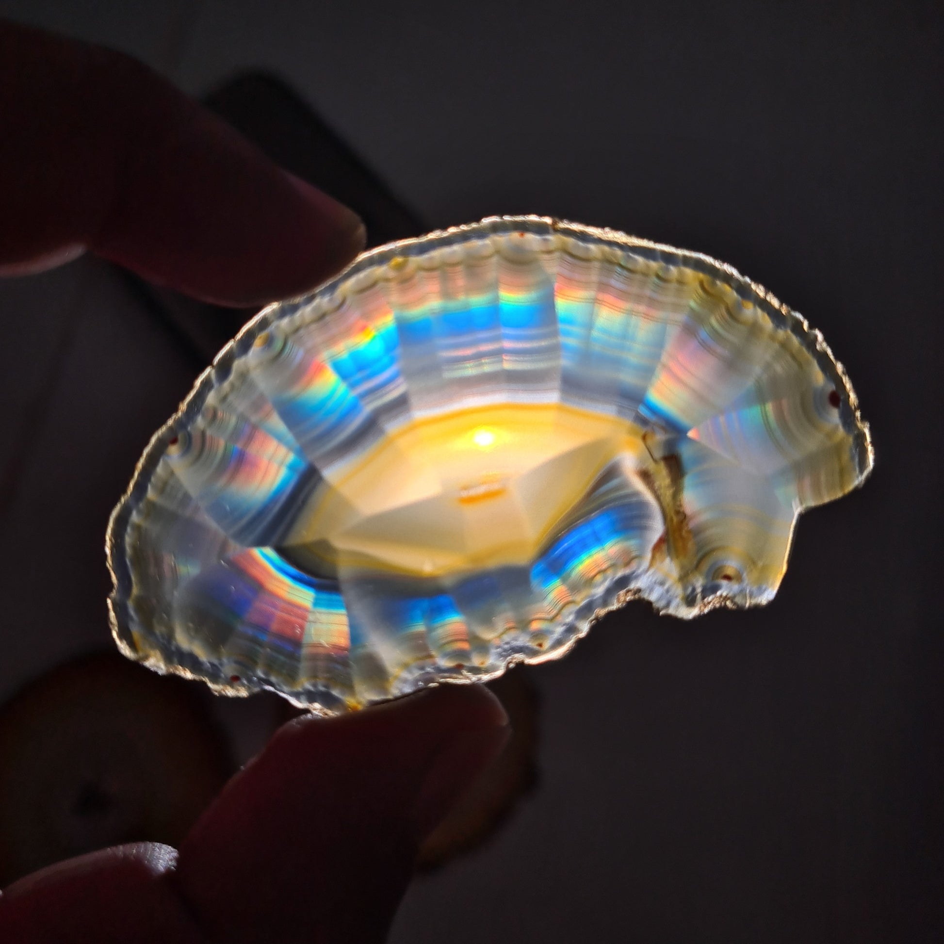 To see the beautiful rainbow of iris agate we should have a light behind. In the natural condition, the slice is look like a pale slab but when it is transmitted to the light you can see beautiful rainbow in it.
