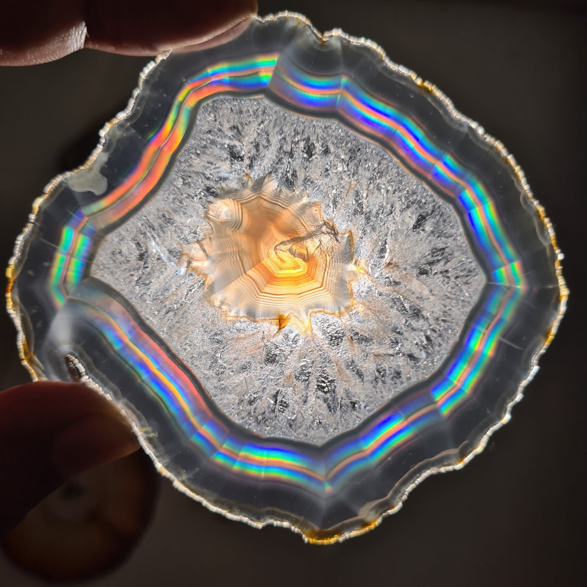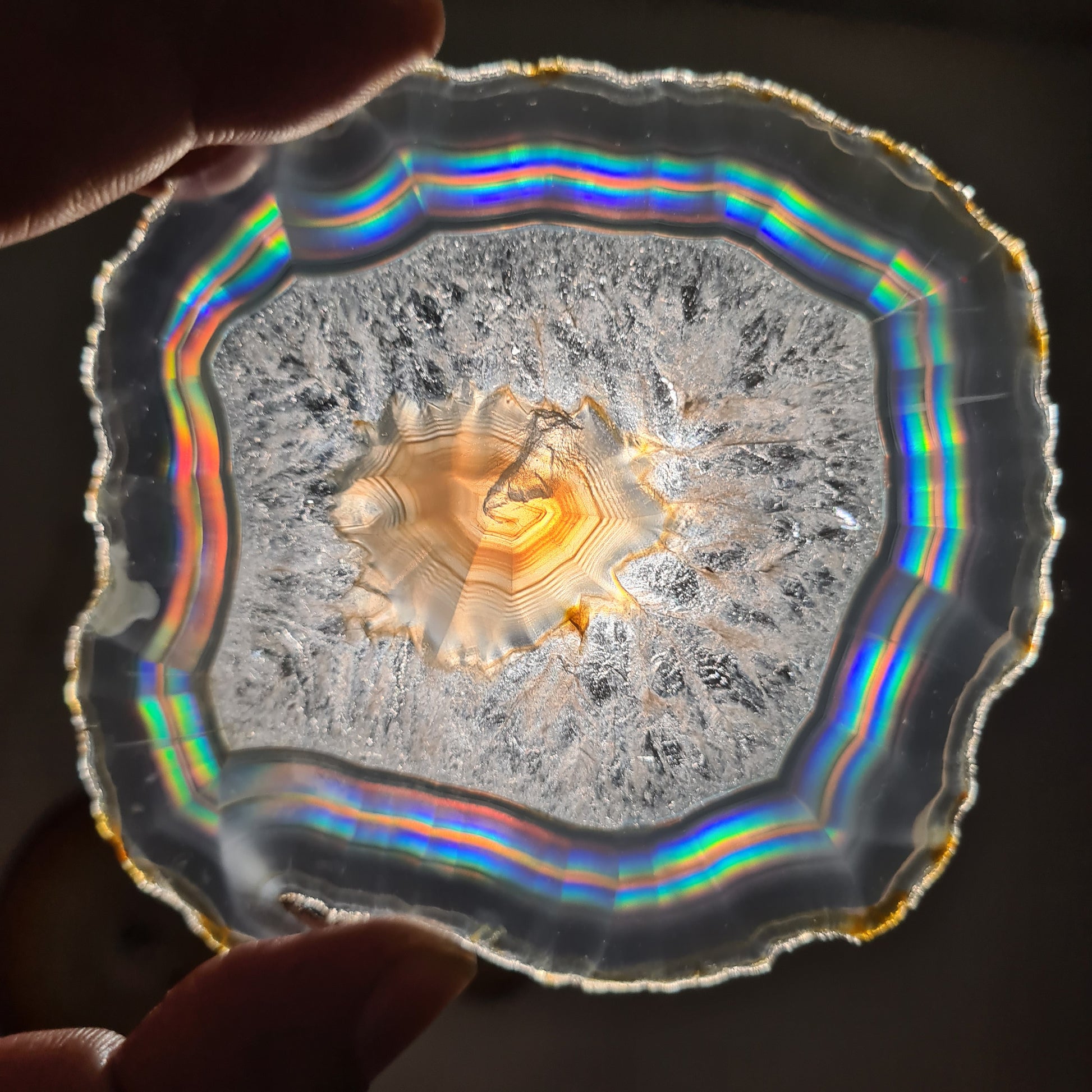 To see the beautiful rainbow of iris agate we should have a light behind. In the natural condition, the slice is look like a pale slab but when it is transmitted to the light you can see beautiful rainbow in it.