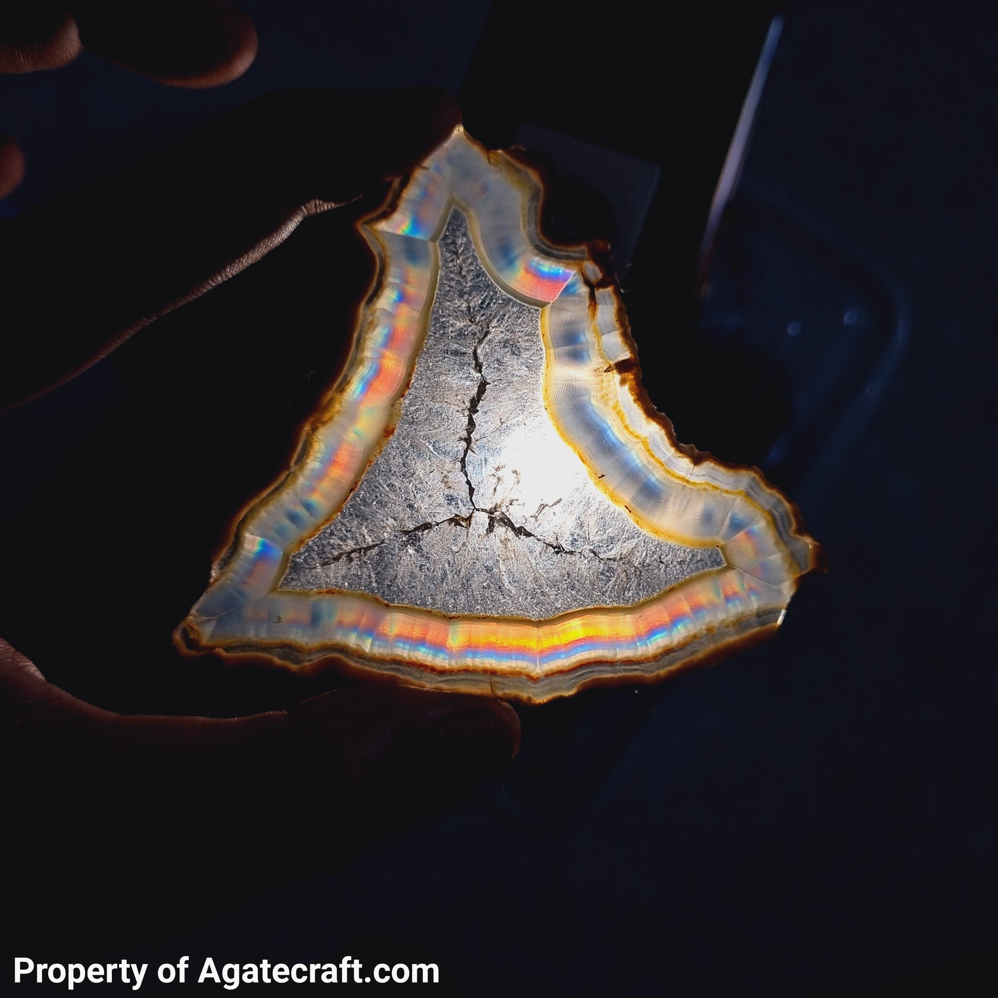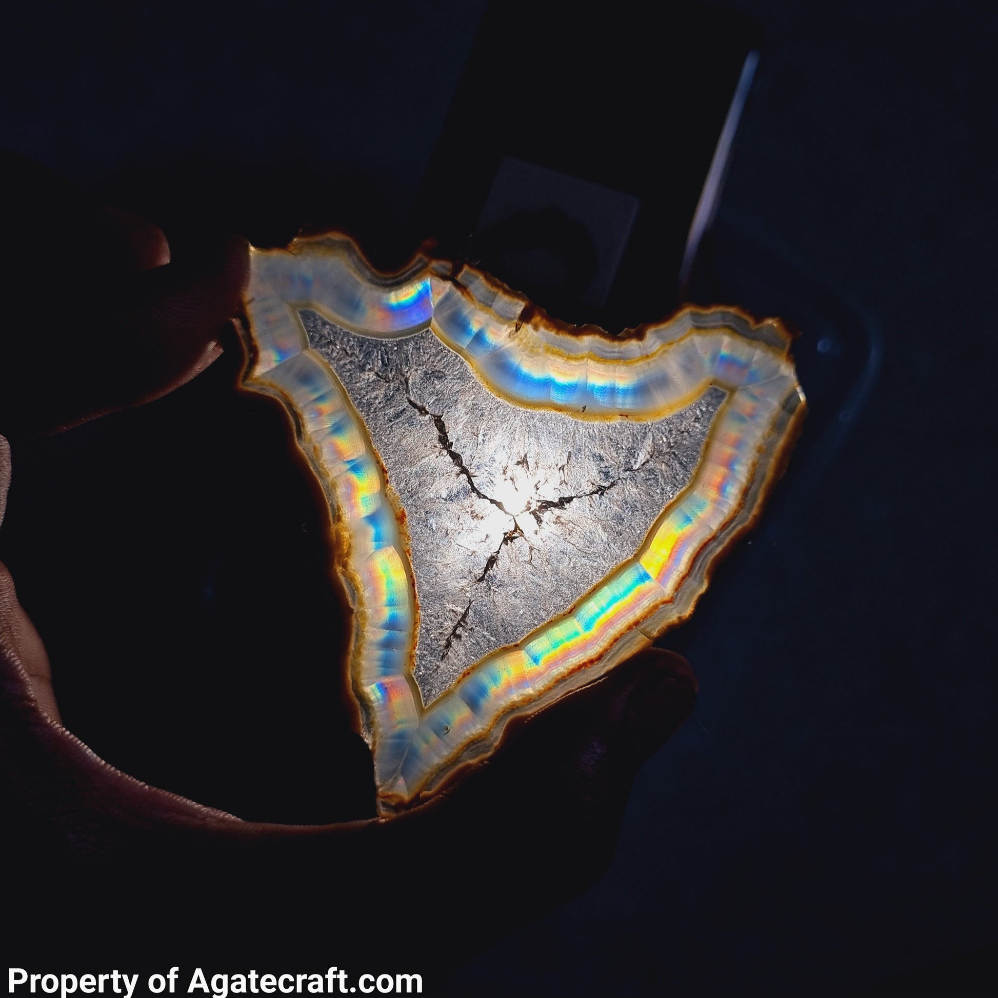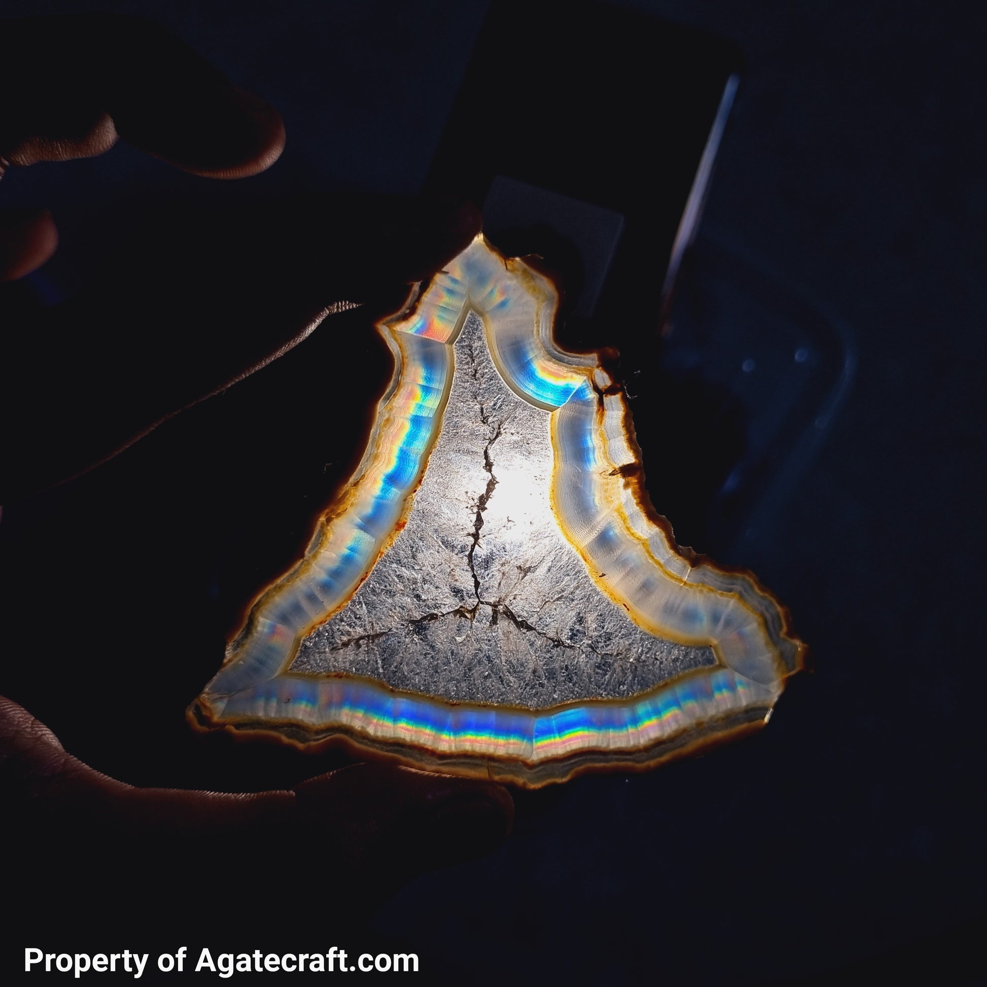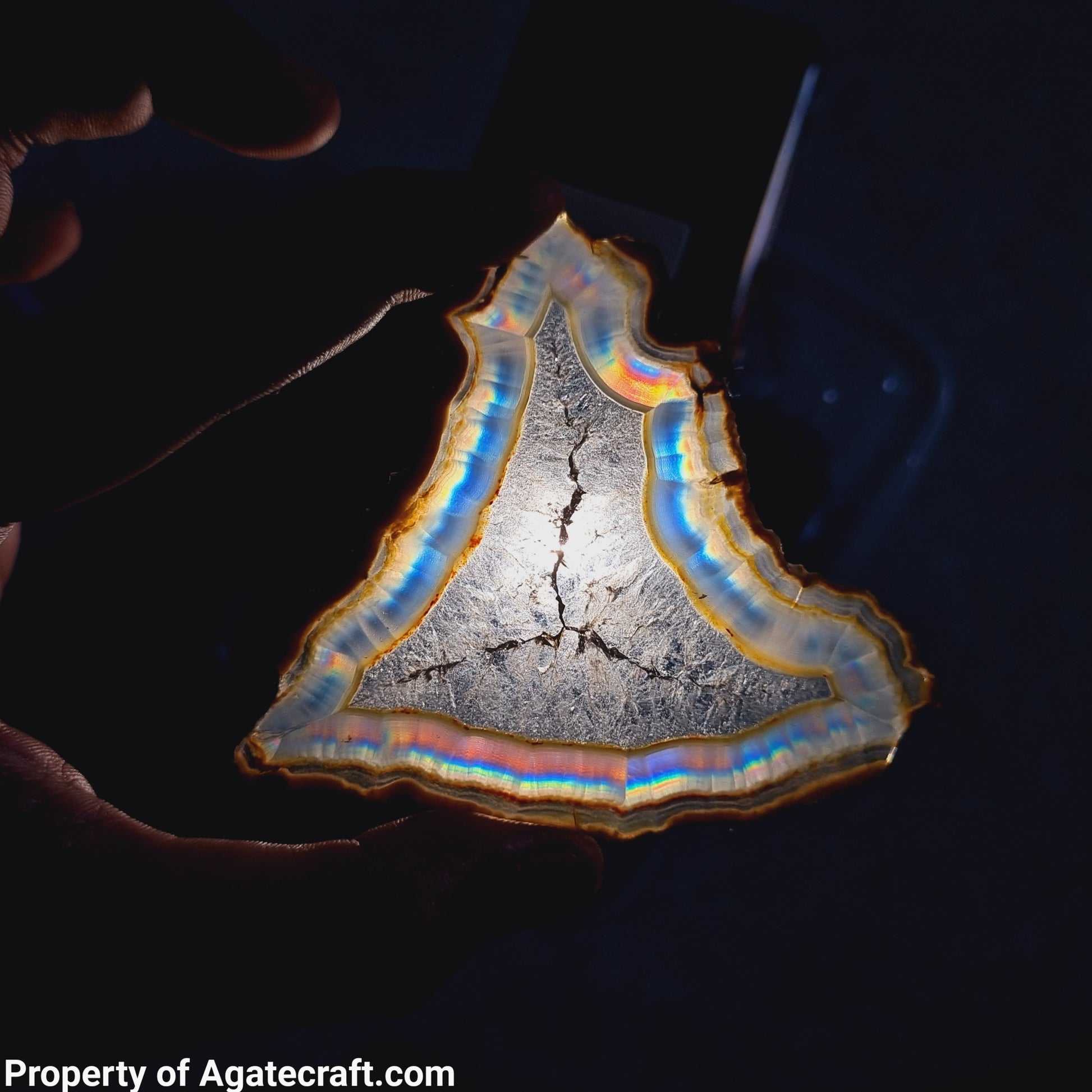 To see the beautiful rainbow of iris agate we should have a light behind. In the natural condition, the slice is look like a pale slab but when it is transmitted to the light you can see beautiful rainbow in it.