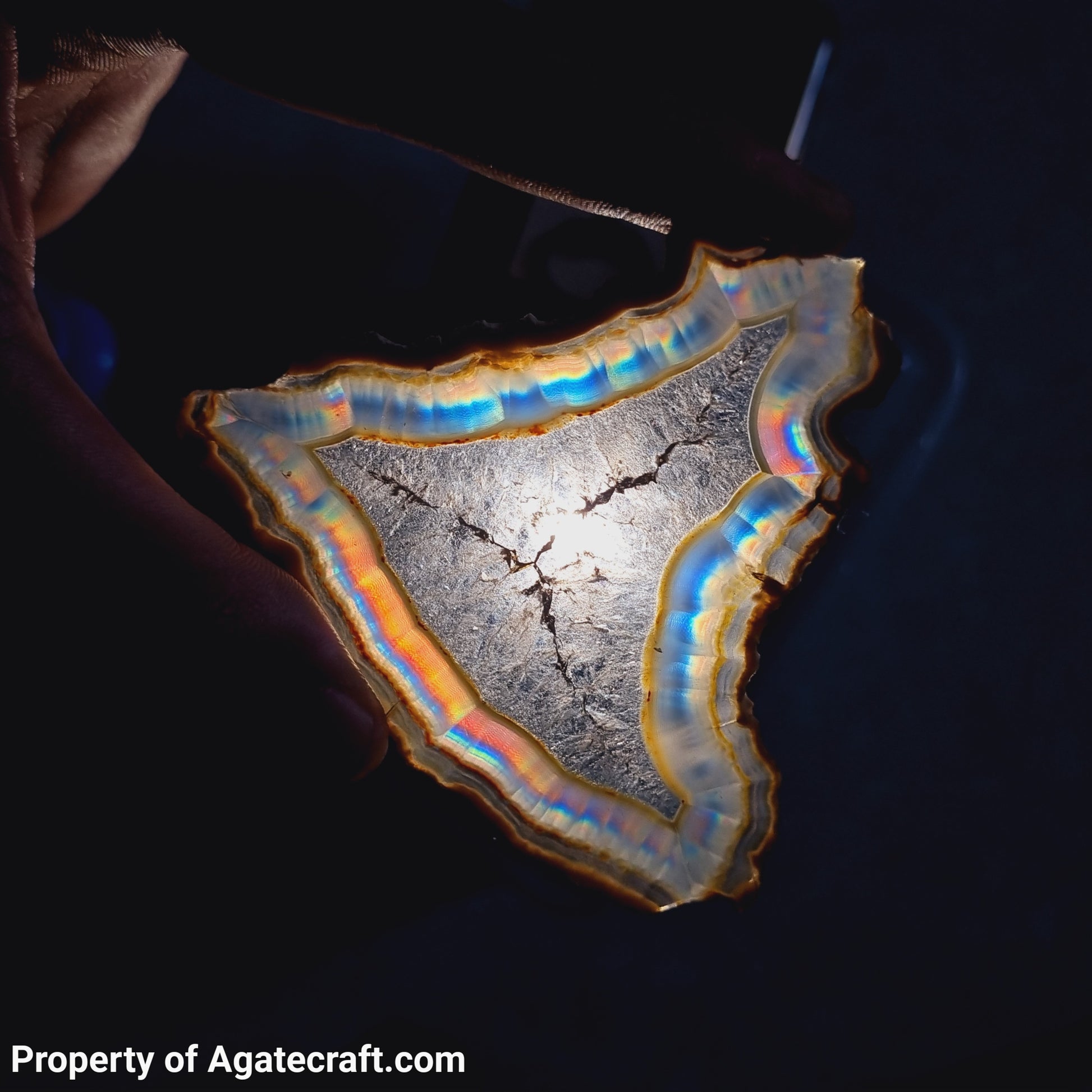 Iris Agate or called Rainbow Agate is a uniquely fine banded agate which creates spectacular display if transmitted into light.