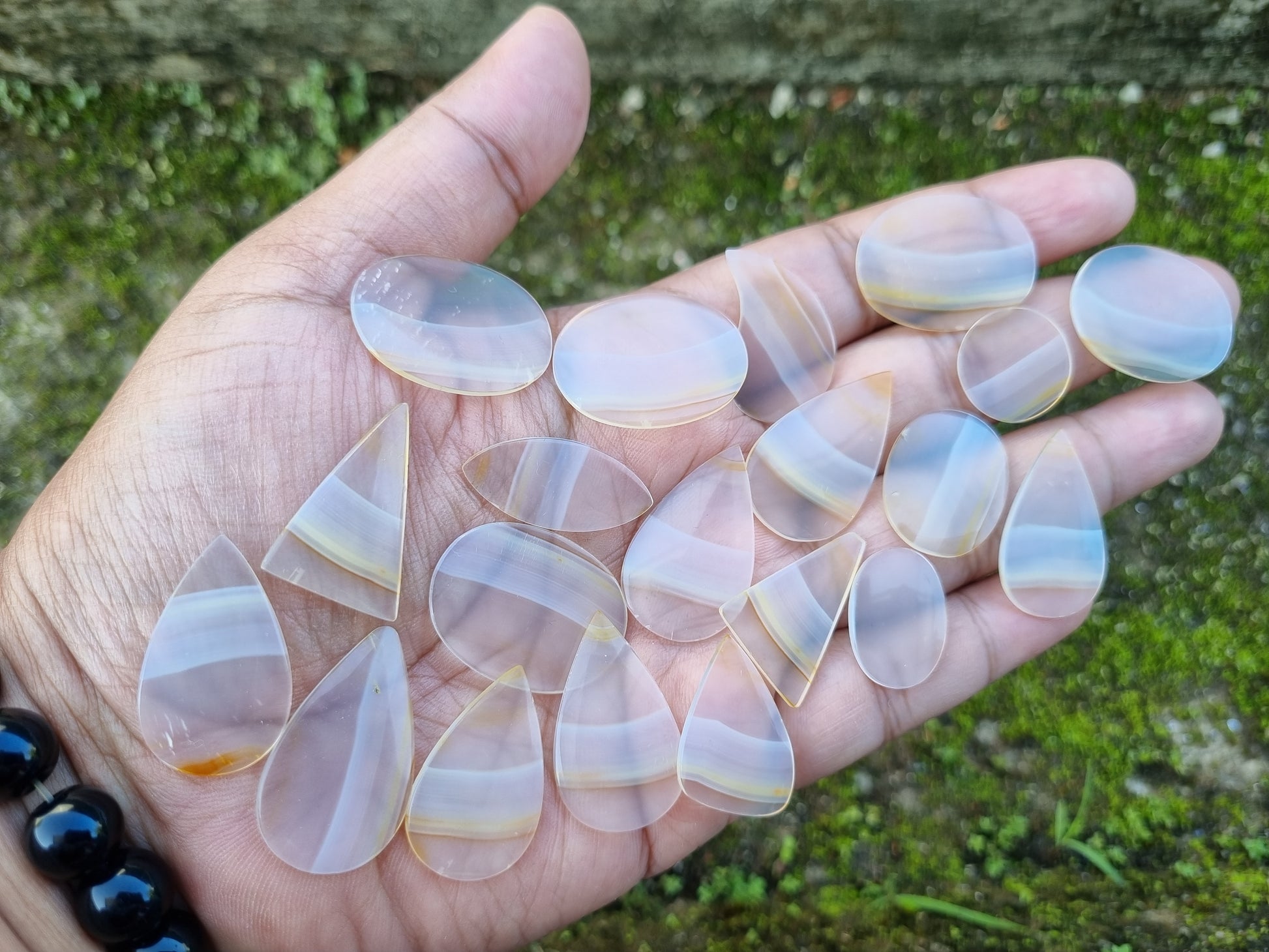 To see the beautiful rainbow of iris agate we should have a light behind. In the natural condition, the slice is look like a pale slab but when it is transmitted to the light you can see beautiful rainbow in it.
