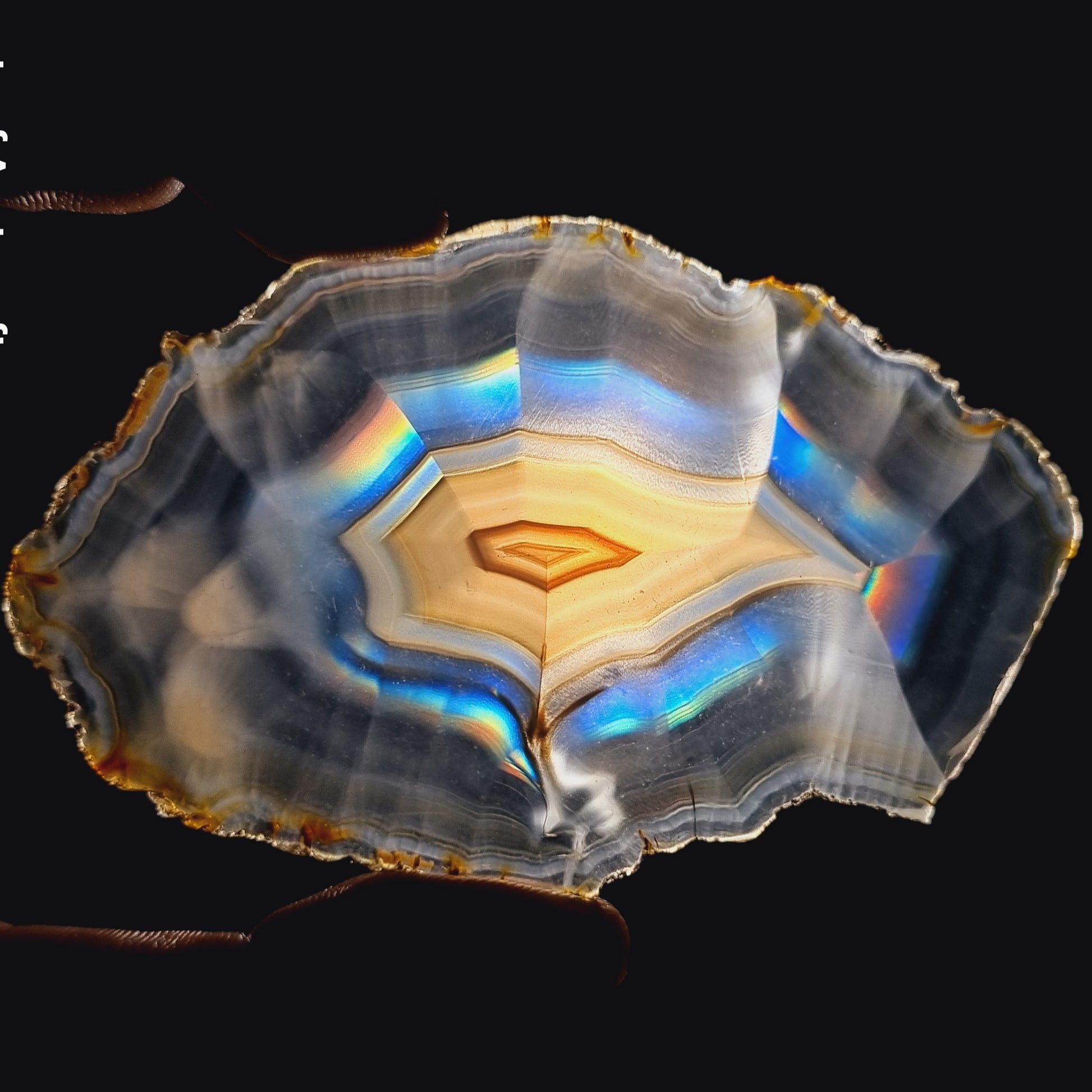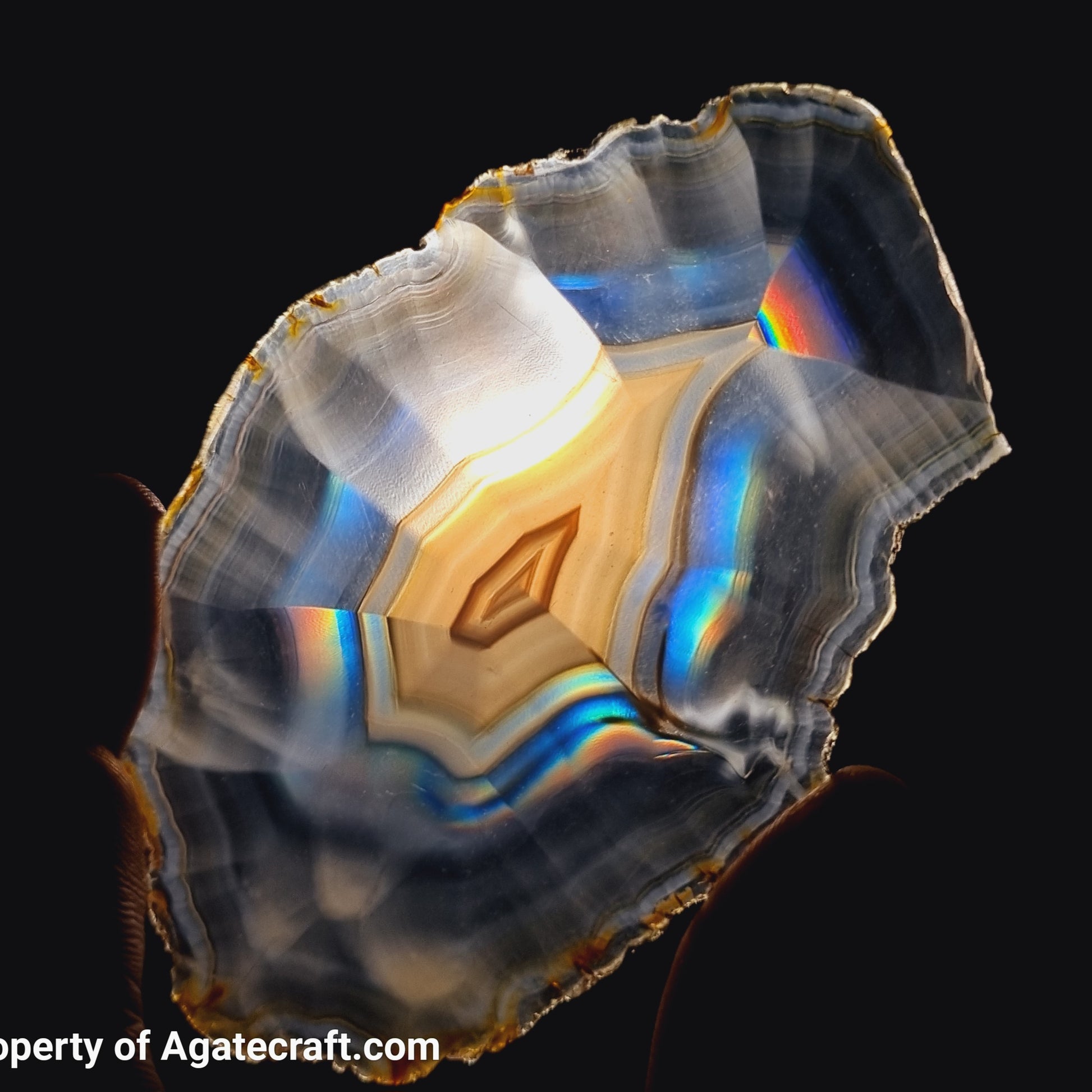 Iris Agate or called Rainbow Agate is a uniquely fine banded agate which creates spectacular display if transmitted into light.