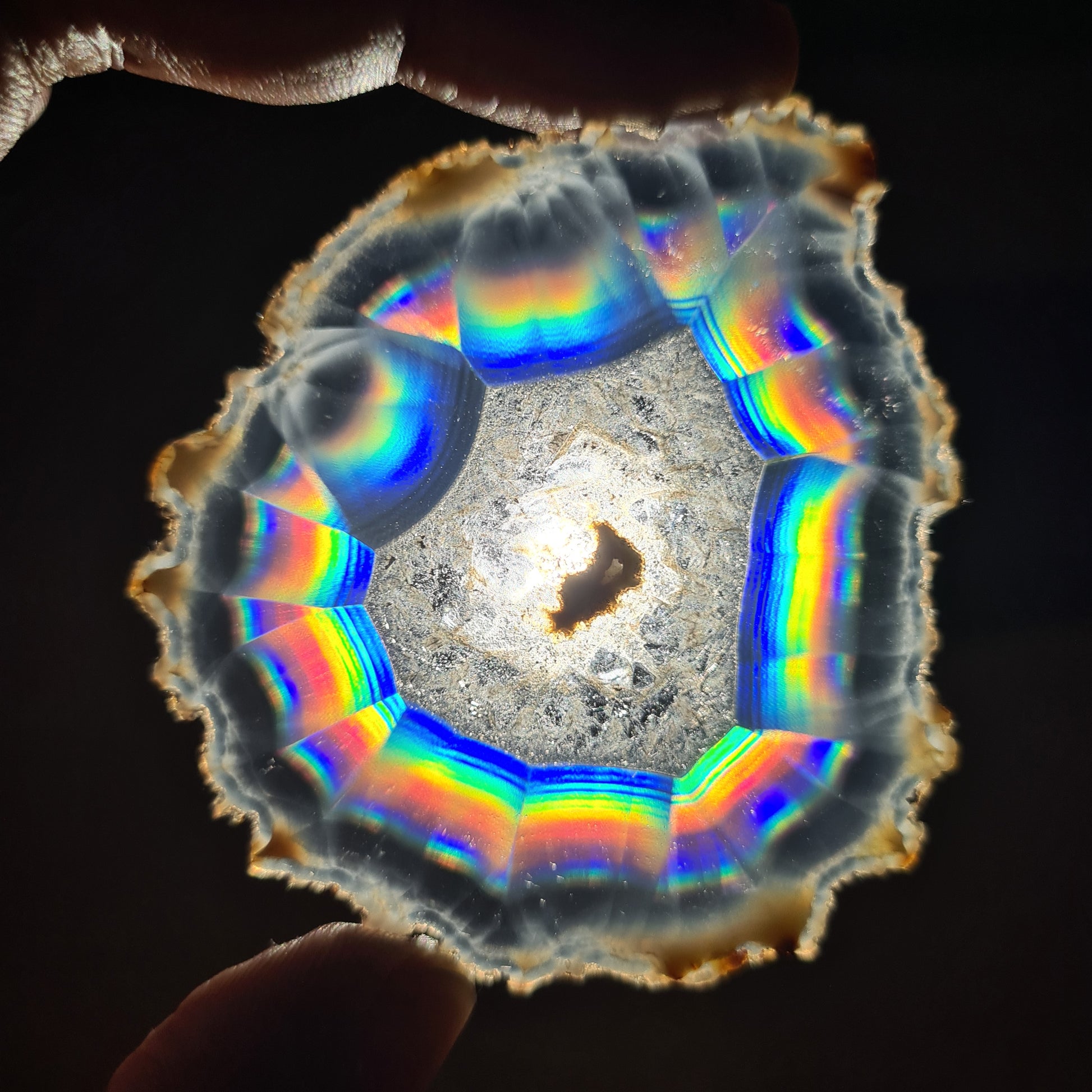 To see the beautiful rainbow of iris agate we should have a light behind. In the natural condition, the slice is look like a pale slab but when it is transmitted to the light you can see beautiful rainbow in it.