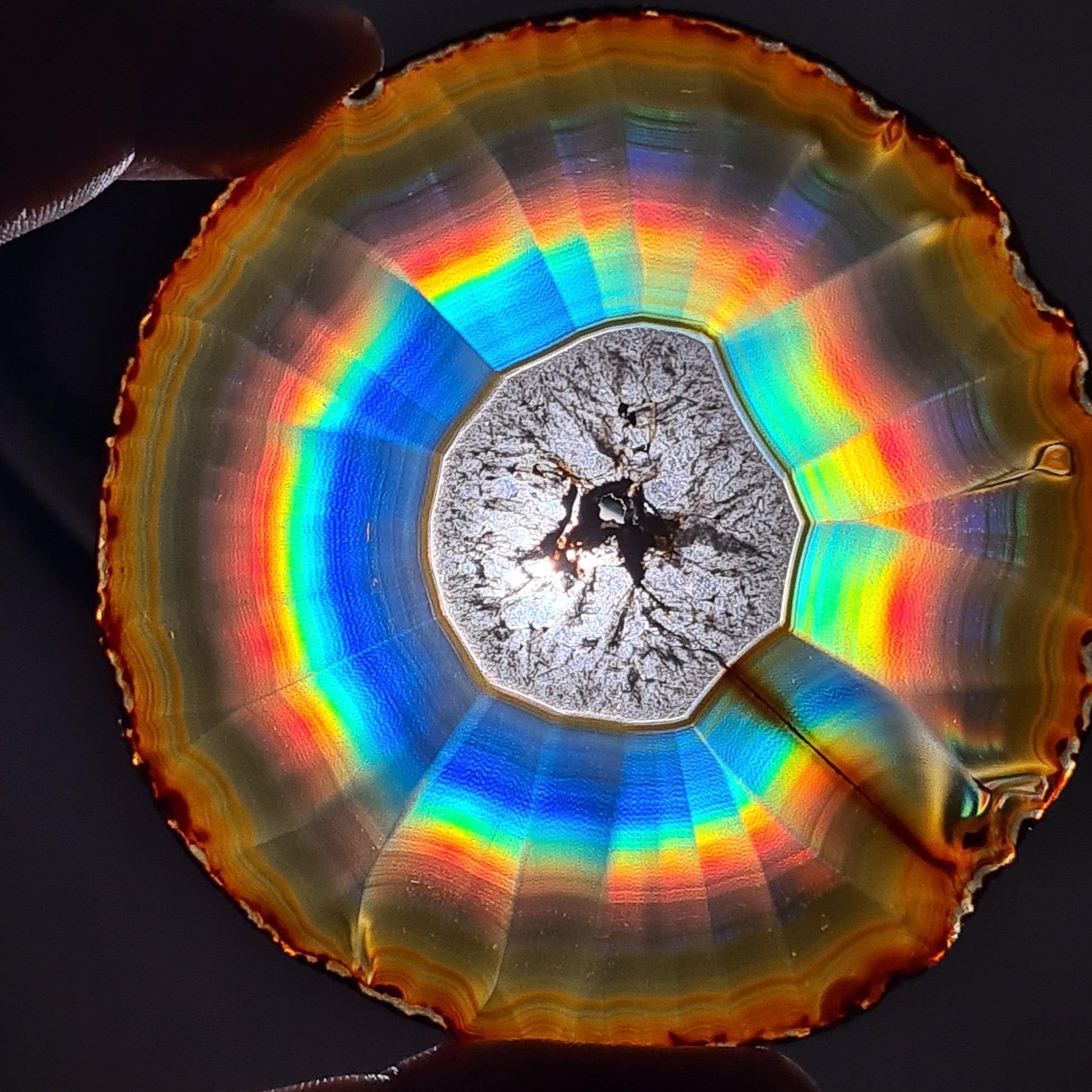 Iris Agate or called Rainbow Agate is a uniquely fine banded agate which creates spectacular display if transmitted into light.
